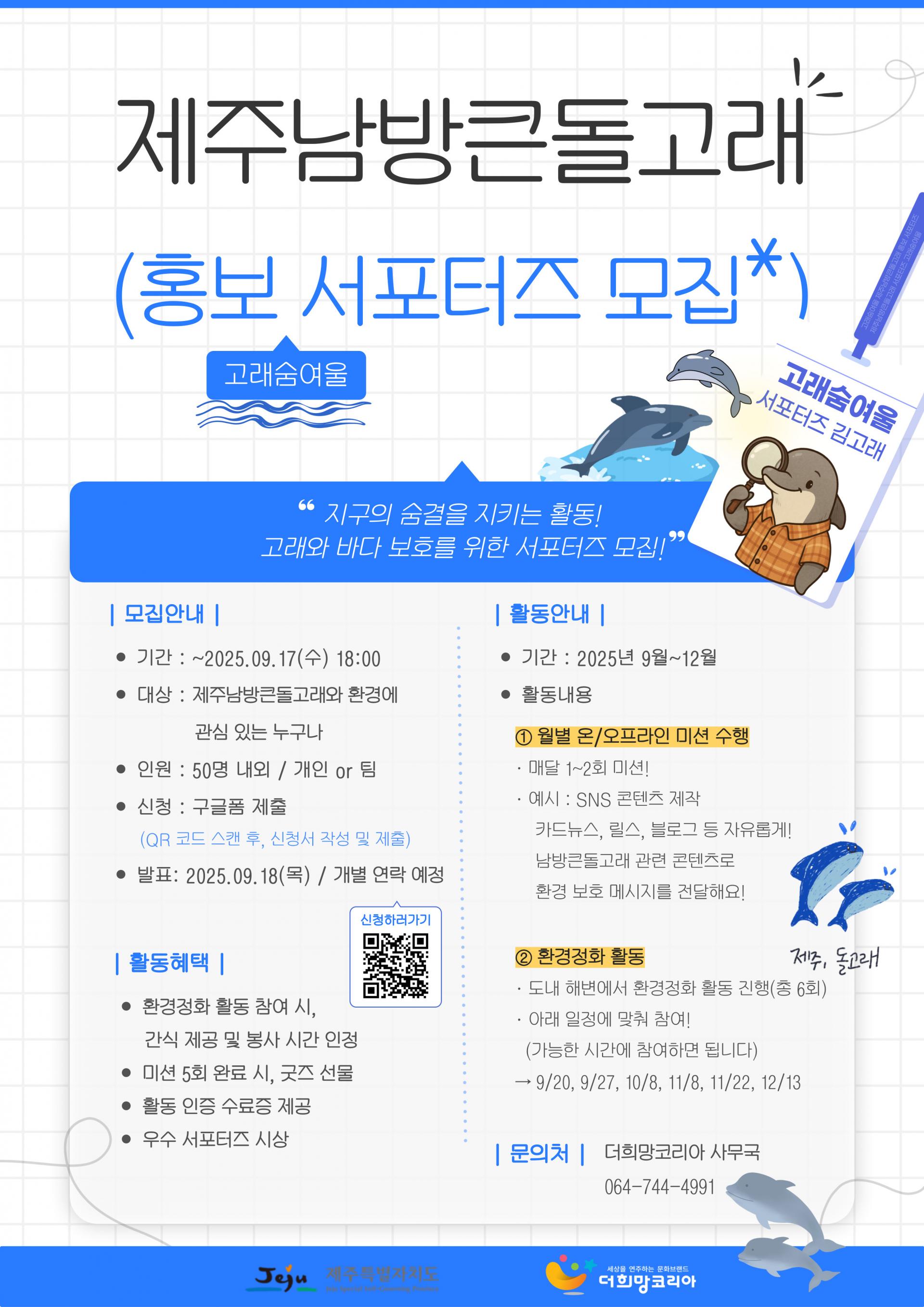 모집 대상: 제주남방큰돌고래와 환경에 관심 있는 누구나